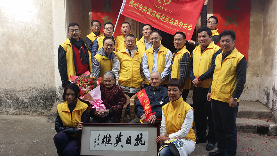 梅州市關(guān)愛抗戰(zhàn)老兵志愿者協(xié)會成立后,大力開展尋訪散居梅州山鄉(xiāng)的抗戰(zhàn)老兵,為尋訪到的每位抗戰(zhàn)老兵舉行民間簡樸又莊重的“贈章授榮”儀式、為困難老兵提供基本生活保障、為抗戰(zhàn)老兵提供日常生活照顧、為老兵過生日、重大節(jié)日慰問、生病看望看護(hù)、為抗戰(zhàn)老兵留影留聲、留手印,歸隊致以哀榮等等關(guān)愛活動,以熱心和誠心,為抗戰(zhàn)老兵送去“遲到的榮譽(yù)”和慰藉。經(jīng)協(xié)會理事會研究,決定對抗戰(zhàn)老兵進(jìn)行日常關(guān)愛的同時,給幸存抗戰(zhàn)老兵每月500元的致敬金。通過發(fā)放關(guān)愛金和致敬金,使老兵每月能獲得1100元的生活保障。2014年9月至2018年5月,廣東省雁洋公益基金會發(fā)放葉劍英基金關(guān)愛金380多萬元,協(xié)會動員社會各界熱心人士和志愿者38600多人次,行程逾10萬公里,為抗戰(zhàn)老兵發(fā)放致敬金及其它慰問金等700多萬元,為抗戰(zhàn)老兵發(fā)放御寒物資一大批、保健品和日常生活用品、慰問品一大批,為住院就醫(yī)的抗戰(zhàn)老兵送上慰問金和輪值守護(hù)陪伴,累計為300多位梅州抗戰(zhàn)老兵及老兵遺孀,廣東以外800多位抗戰(zhàn)老兵及老兵遺孀送上了最真摯的關(guān)懷。